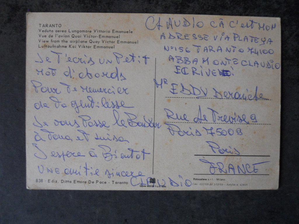 Cartolina TARANTO LUNGOMARE VEDUTA AEREA ANNI 70 [AFZ]€4,00 Condizioni come da foto 1 disponibili Cartolina TARANTO LUNGOMARE VEDUTA AEREA ANNI 70 [AFZ] quantità Aggiungi al carrello Categoria: Cartoline Tag: Cartolina TARANTO LUNGOMARE VEDUTA AEREA ANNI 70 [AFZ] Descrizione Descrizione Per ulteriori dettagli contattatemi Prodotti correlati Cartolina Natalizie anno 2001 Roma Calcio – DELVECCHIO 1 [GS4] €5,00 Aggiungi al carrello Rarissima Cartolina Lenticolare di Magnus Le Femmine Incantate [C91] €50,00 Aggiungi al carrello Cartolina INTER FC Anno 1988 MATTEOLI autografo stampato 16,5×23,5 cm [M13] €4,00 Aggiungi al carrello CARTOLINA POSTCARD GIORGIO CHINAGLIA Nazionale Italia 1974 [GS42] €4,00 Aggiungi al carrello