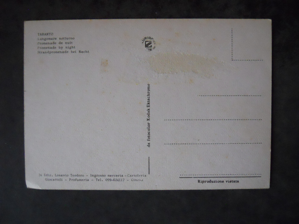 Cartolina TARANTO LUNGOMARE VITTORIO EMANUELE NOTTURNO 1970 [AFZ-2]€4,00 Condizioni come da foto 1 disponibili Cartolina TARANTO LUNGOMARE VITTORIO EMANUELE NOTTURNO 1970 [AFZ-2] quantità Aggiungi al carrello Categoria: Cartoline Tag: Cartolina TARANTO LUNGOMARE VITTORIO EMANUELE NOTTURNO 1970 [AFZ-2] Descrizione Descrizione Per ulteriori dettagli contattatemi Prodotti correlati Cartolina anni 60 originale John Lennon Ricordi 12×17 €2,50 Aggiungi al carrello CARTOLINA POSTCARD FRANCO CAUSIO Nazionale Italia 1974 [GS42] €3,00 Aggiungi al carrello Invito Quaresima Cartolina Riti Settimana Santa Taranto 2016 [C75] €3,00 Aggiungi al carrello Cartolina INTER FC Anno 1988 MATTEOLI autografo stampato 16,5×23,5 cm [M13] €4,00 Aggiungi al carrello